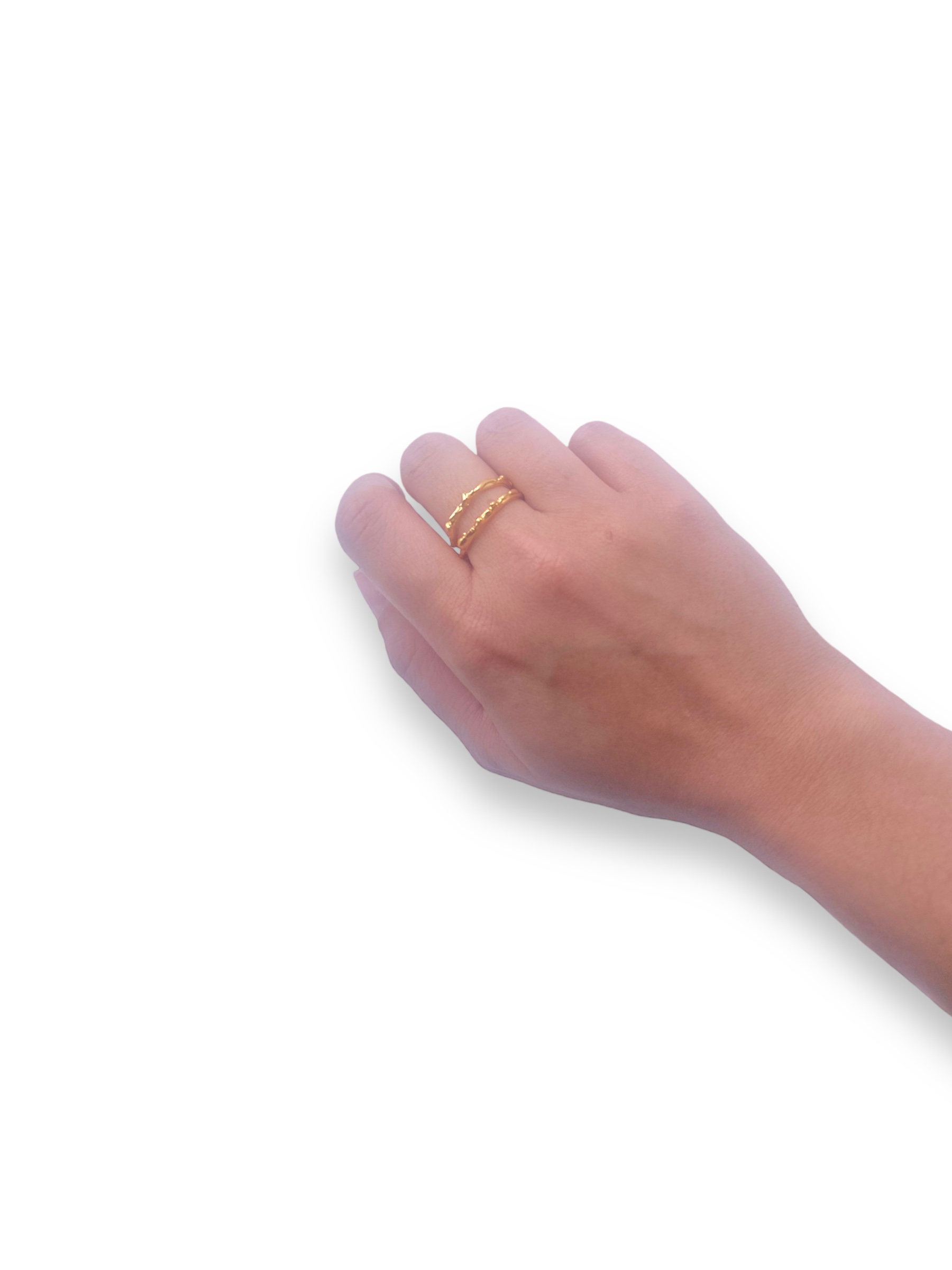 Χειροποίητο δαχτυλίδι από ορείχαλκο, με ανοιγόμενο σχεδιασμό και διπλή, ανάγλυφη επιφάνεια που δημιουργεί ένα παιχνίδι φωτός και σκιάς.