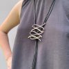 A distinctive, handcrafted necklace that stands out for its unique fastening and the combined texture of metal and leather.