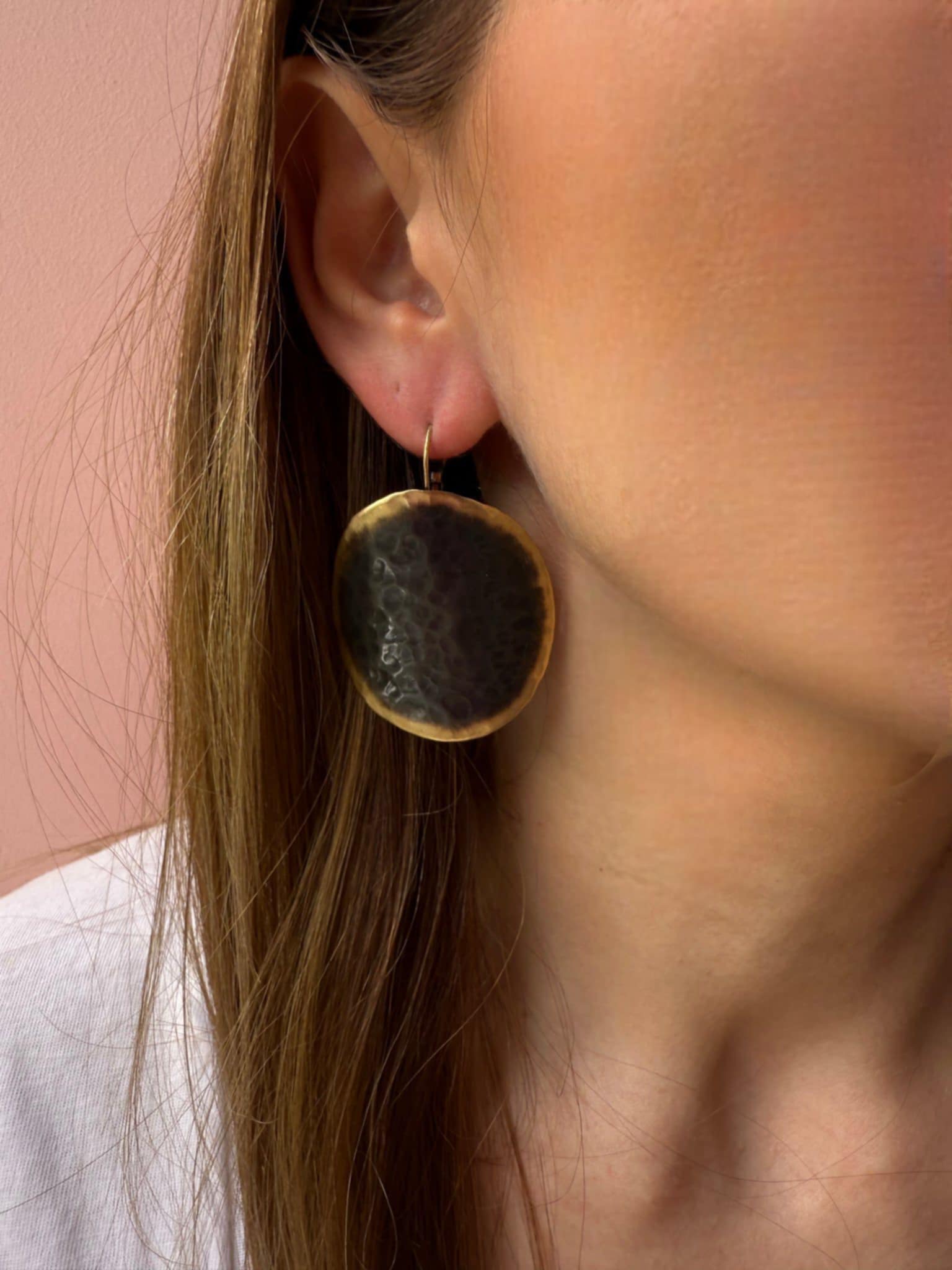 Χειροποίητα σκουλαρίκια από καθαρό ορείχαλκο, με εντυπωσιακή μαύρη οξείδωση και γυαλισμένο χείλος που αναδεικνύει την αντίθεση.
