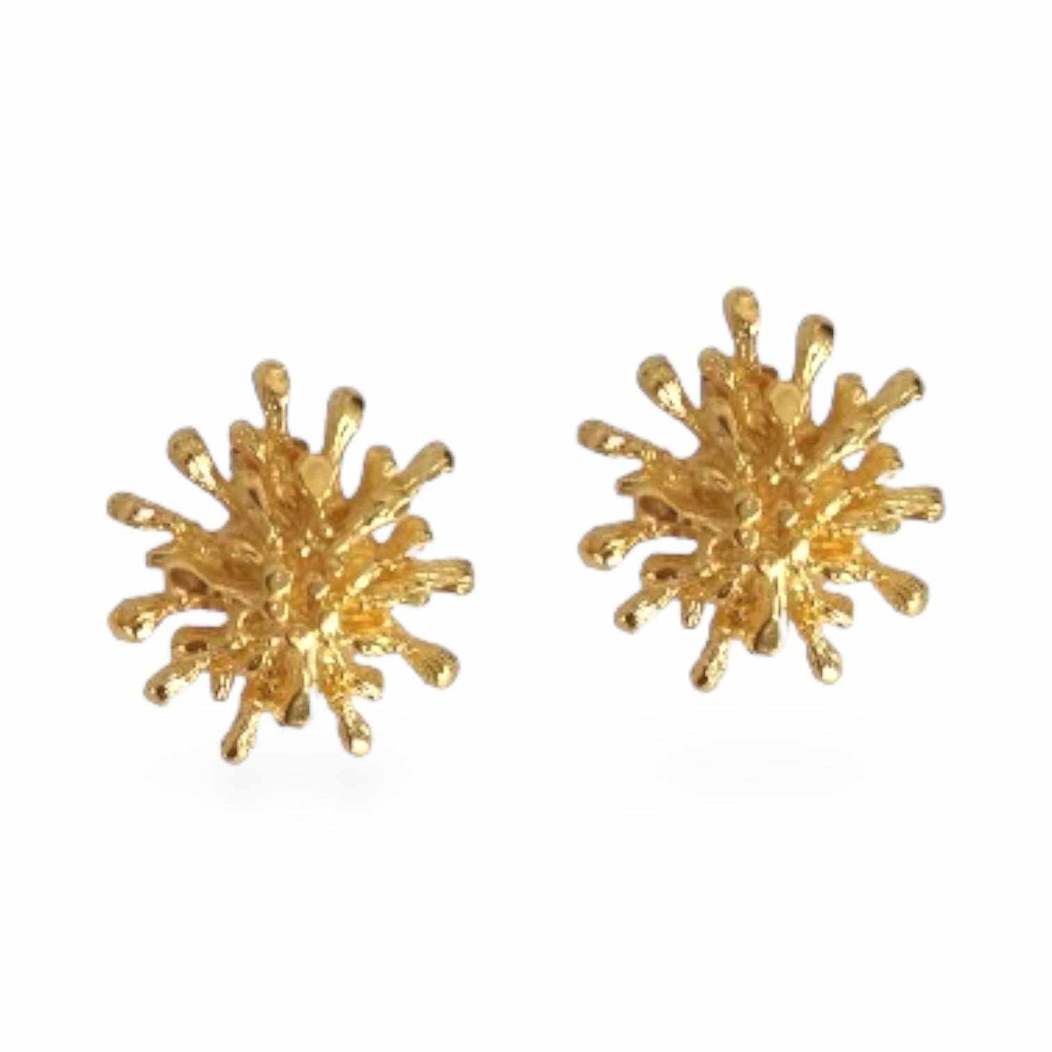 Χειροποίητα σκουλαρίκια από ορείχαλκο με ανάγλυφο, vintage σχέδιο που θυμίζει άνθος ή ηλιακή έκρηξη — ένα μικρό γλυπτό φωτός και υφής. Κάθε κομμάτι έχει διαστάσεις 3 x 3 x 3 εκ., προσφέροντας ένταση χωρίς βάρος.